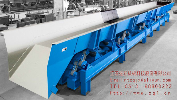 振動輸送機是一種無牽引構件的連續輸送機械。它是利用機械共振原理來輸送物料的。振動輸送機主要由承載構件、彈性元件及激振器等組成。激振器足振動輸送機的驅動機構動力源,用以產生激振力,使承載槽產生持續的振動。激振力的大小直接影響著承載的振幅,其交變頻率即為輸送機的工作頻率。承載體為槽形或管形振動料槽,在振動過程中,將能量傳給物料,使之沿輸送方向作連續拋擲運動。承載體為參振質體,需具有足夠的剛度和強度。減振支承裝置既是整機的支承裝置,又作減振用。